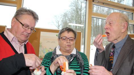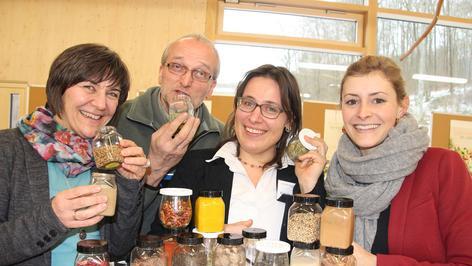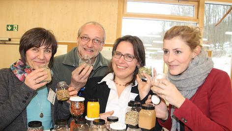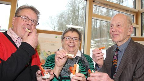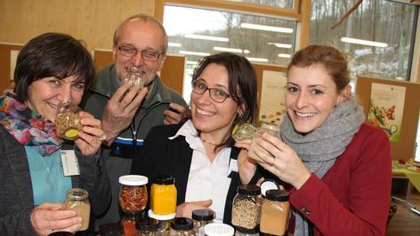 Georg Wagner und seine Frau Waltraud (65) gehören zu den Ersten, die ausprobieren, was die Genuss-Inseln im Steigerwald-Zentrum zu bieten haben. Ehe sie sich an der „Sport-Insel“ zu täglichen Bewegungsübungen inspirieren lassen, widmen sie sich erstmal der Ernährung. Aus verschiedenen Brotstückchen versuchen sie herauszuschmecken, welches der „Probiererli“ denn nun aus Vollkorn ist. „Gar nicht so leicht!“, stellen sie verblüfft fest. Und noch mehr erstaunt, dass die Farbe allein kein guter Hinweisgeber ist. Klaudia Schwarz stellt klar: „Wer denkt, je dunkler, desto besser, der irrt. Oft werden Brote aus Weißmehl mit Zuckerrüben- oder Karamellsirup beziehungsweise Malzextrakt eingefärbt und so für Vollkornbrote gehalten.“
