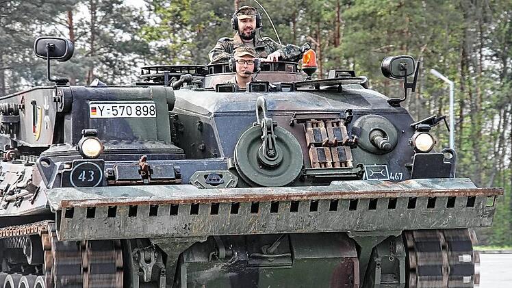 21 Fahrzeuge fuhren nach und nach auf den betonierten Übungsplatz. Vom Geländewagen „Wolf“ über den Unimog und einen Straßentankwagen, der bis zu 18 000 Liter Kraftstoff fassen kann, bis hin zum 130 Tonnen schweren „Mammut“, einem Schwerlasttransporter mit 24 Metern Länge. Einige Bataillon-Mitglieder zeigten ihre Fähigkeiten: Sie hoben ein 1500 PS starkes Triebwerk mit Hilfe eines „Bergepanzers“ aus dem Leopard, wechselten einen überdimensionalen Reifen am Geländewagen und führten die Funktion eines Hebekranes vor. Handgriffe und Abläufe, die im Einsatzgebiet reibungslos funktionieren müssen.