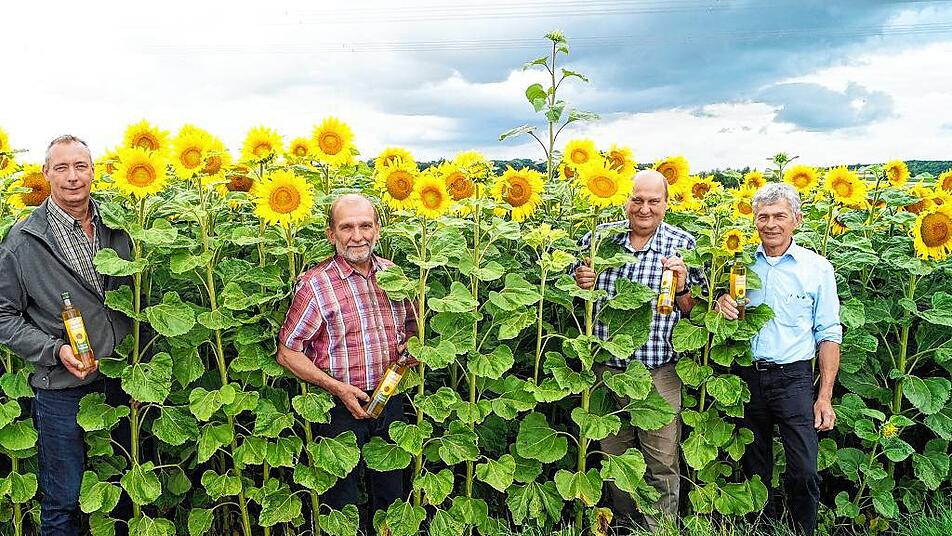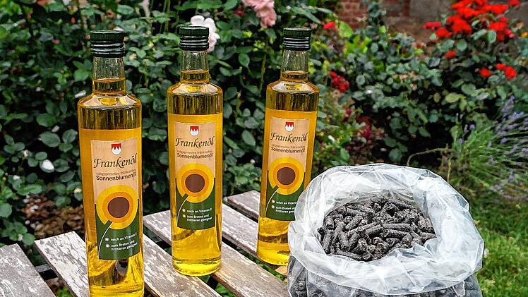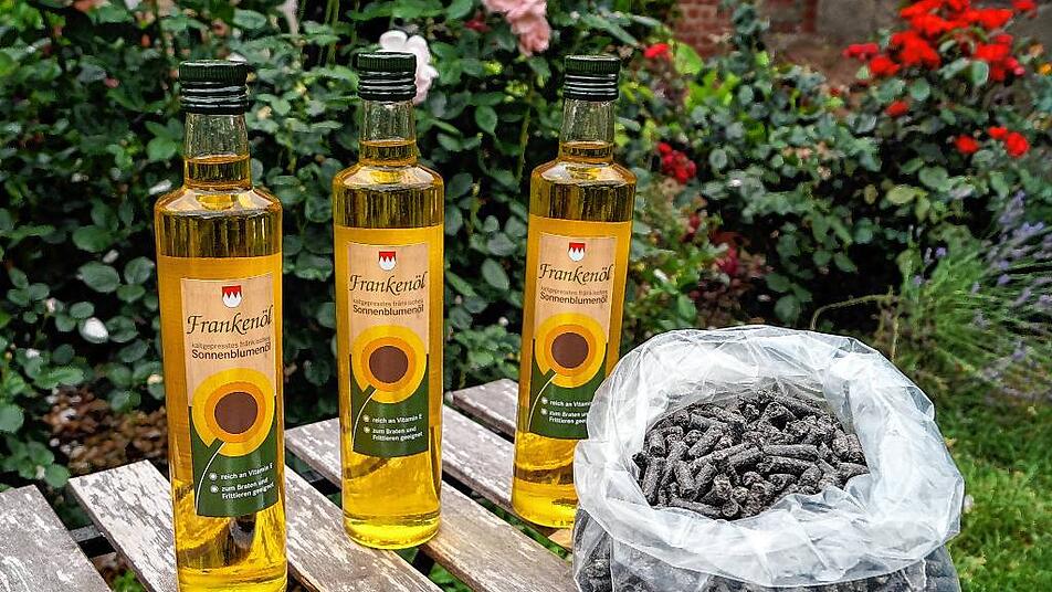 Die Flasche ziert der rotweiße Rechen, der Name verrät die Herkunft: Das leuchtend gelbe „Frankenöl“ ist ein regionales Produkt. Für die Bewohner im Landkreis Kitzingen und der näheren Umgebung könnte man sogar sagen, ein lokales Produkt. Schließlich wachsen die High Oleic Sonnenblumen, aus denen das Öl hergestellt wird, auf den Feldern im Raum Kitzingen. Genauer: Auf den Feldern der Landwirte, die sich zur „Erzeugergemeinschaft für Qualitätsgetreide und Sonnenblumenkerne Kitzingen und Umgebung“ zusammengeschlossen haben. Weite Transportwege gibt es nicht: Die Lagerung erfolgt in Kleinlangheim, die Verarbeitung in der Ölmühle in Rüdenhausen, das Öl wird dort sowie in den Edeka-Märkten verkauft.