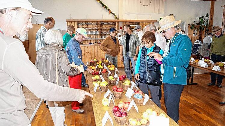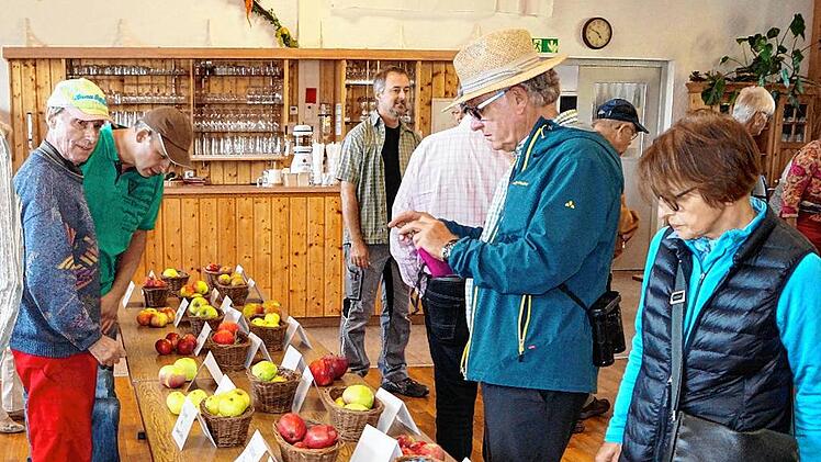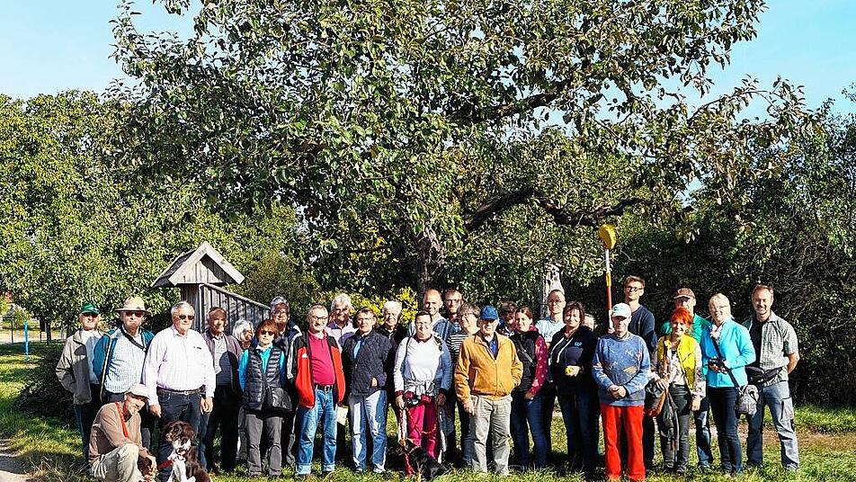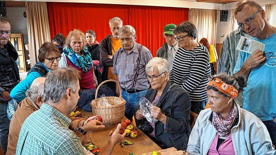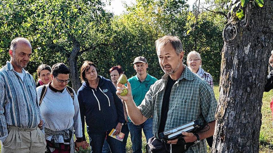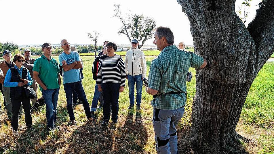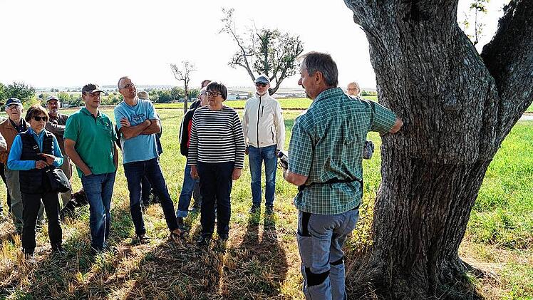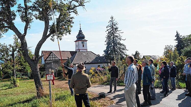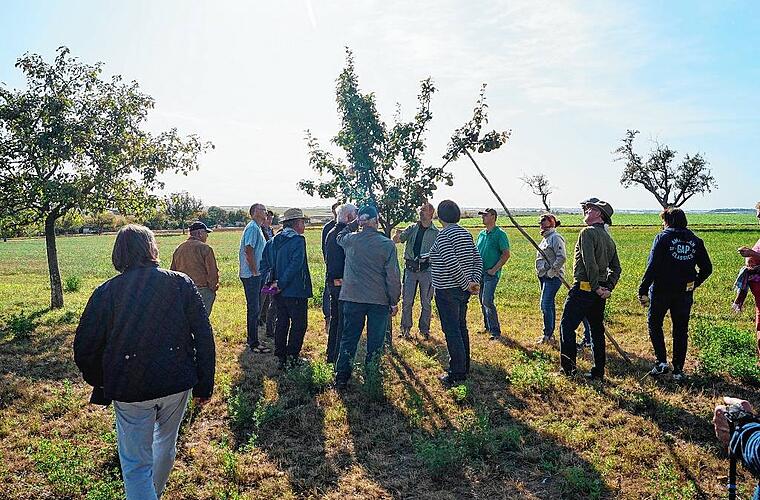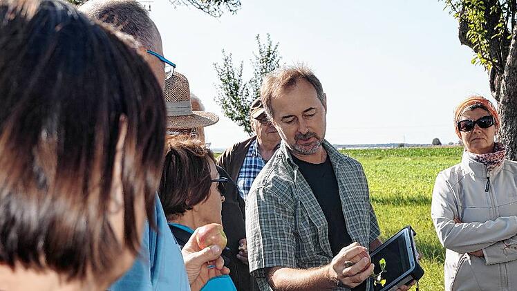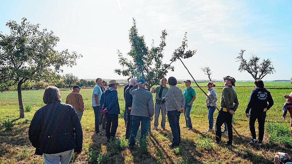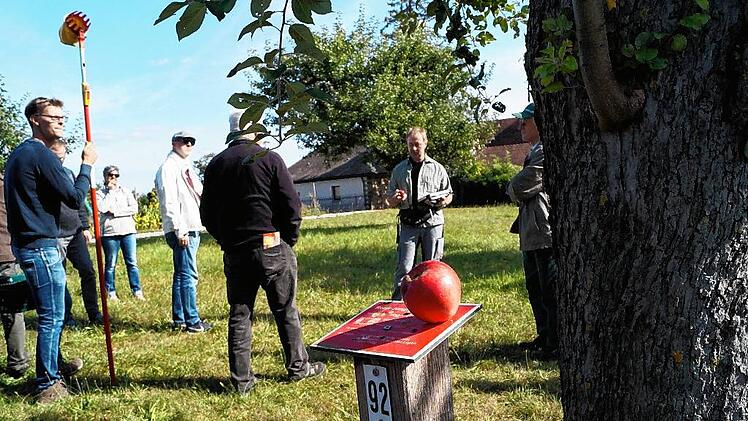 Etwa 30 Frauen und Männer stehen am Ortsrand von Markt Herrnsheim inmitten von Bäumen. Sie sind der Einladung des Landkreises zum Streuobst- und Sortentag gefolgt und hören den Ausführungen von Steffen Kahl aufmerksam zu. Er ist Pomologe, befasst sich also mit Obstsorten und dabei besonders mit dem Streuobst. Gemeinsam mit Jonas Braun vom Landschaftspflegeverband kartiert er derzeit die Streuobstbestände im Landkreis Kitzingen. Die Sorten werden bestimmt, Altersstruktur und Vitalität der Bäume, Unterwuchs und Pflegezustand vermerkt. Die Bürger sind zur Mithilfe aufgerufen: Sie sollen Jonas Braun melden, wie viele und welche Bäume auf ihren Grundstücken stehen.