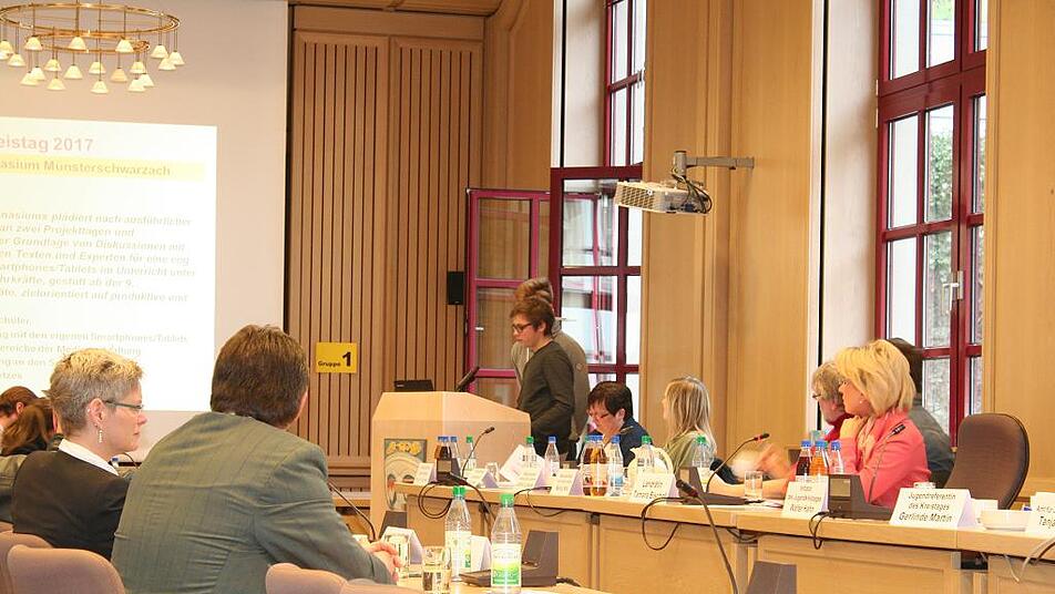 Schüler aus acht Schulen machten in kurzen Präsentationen ihren Standpunkt klar. Im Vorfeld herausgearbeitete Argumente und sogar eigene Umfragen stützten ihre Ausführungen. Smartphones wären ein ausgezeichnetes Rechercheinstrument, heißt es, vielleicht ließe sich so sogar die Menge an schweren Büchern reduzieren. Außerdem müsse ein WLAN-Zugang für die Schüler her. „Das digitale Klassenzimmer ist das Modell der Zukunft“, findet die Schülerdelegation der Realschule Dettelbach.