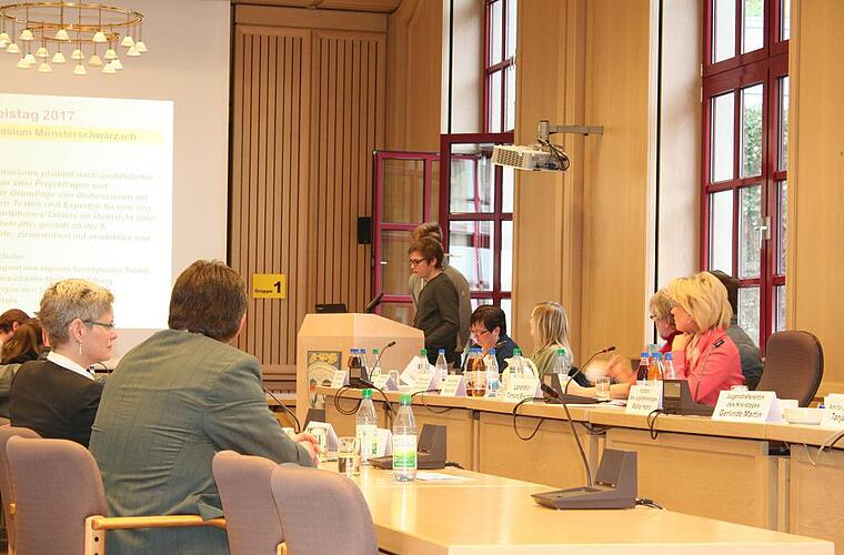 Er ergänzte: „Und wer bildet die Lehrer dafür aus?“ Ein Denkanstoß, der kurz darauf auch in den kleinen Diskussionsgruppen aus Schülern, Lehrern, Politikern und Experten ein Thema ist. Angeregt wird diskutiert, die Ideen der Schulen werden noch verfeinert. Die Anträge, die am Ende zur Abstimmung gestellt werden, ähneln sich: Die Nutzung von Smartphones und Tablets im Unterricht soll erlaubt werden. Aber die Schüler liefern auch einige konstruktive Ansätze und Einschränkungen: Wirklich sinnvoll sei die Nutzung erst in höheren Jahrgangsstufen, zum Beispiel ab der neunten Klasse. Auch Testphasen in ausgewählten Klassen wurden vorgeschlagen. Und: Schulungen für die Lehrer seien dringend notwendig.