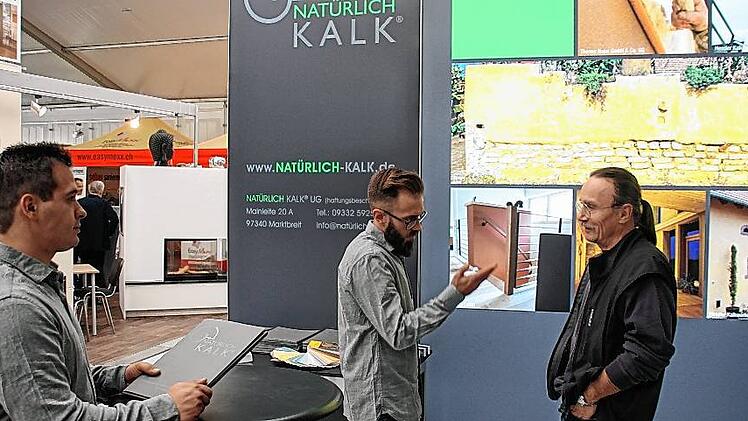 Vergleichsweise euphorisch bewerten Philipp Engist und Sascha Zorcec die ersten Tage auf der Mainfrankenmesse. Für ihr Marktbreiter Unternehmen „Natürlich Kalk UG“ ist es der erste große Auftritt auf einer Messe. Von „tollen Gesprächen“ berichtet Junior-Chef Engist. „Die Leute fragen gezielt nach“, sagt er und ist sicher: „Es werden sich auch viele nach der Messe bei uns melden.“ Die Marktbreiter Firma ist erst vor einem Jahr gegründet worden, hat sich auf die Anwendung von schadstofffreien Materialien und Naturbaustoffen auf dem Bau spezialisiert. Die Vorteile von Naturkalk, Lehm, von einer Hanf- oder Jutedämmung sind deshalb auch das Gesprächsthema am Stand. In die Präsentation haben sie jede Menge Arbeit gesteckt. „Die Vorbereitungen haben schon vor mehr als einem halben Jahr begonnen“, berichtet Philipp Engist. Broschüren und ein erster Messestand mussten entwickelt werden. Mit befreundeten Grafikdesignern und Messebauern haben sie zusammengearbeitet, die Texte selbst entworfen.