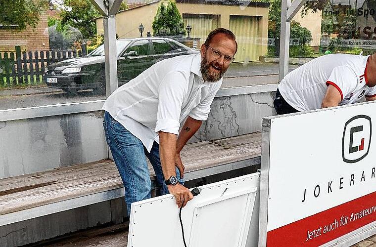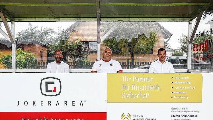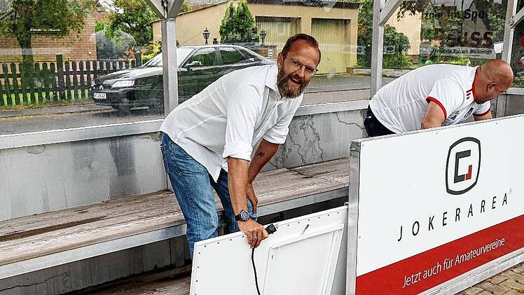 Schwarzachs Sportvorstand Josef Hitzinger, Jokerarea-Erfinder Dieter Wirsching und Werbepartner Stefan Schöderlein tragen die Module zur Ersatzbank des Stadtschwarzacher Sportgeländes. Die ist bereits mit zwei Werbebanden versehen. Auf der einen prangt mit großen Lettern auf weißem Hintergrund der Schriftzug „Jokerarea“, auf der anderen das Emblem von Schöderleins Versicherungskanzlei. Aber die Werbung ist nicht das Besondere. Vielmehr das, was dahintersteckt. Nämlich die Halterung für die Heizmodule, die die Drei in wenigen Minuten in diese hineinschieben. Jetzt nur noch den Stecker eingesteckt und keiner würde mehr kalte Füße bekommen.