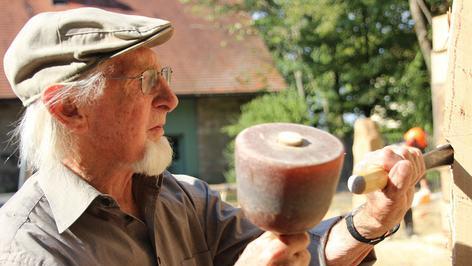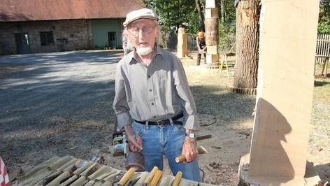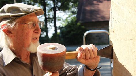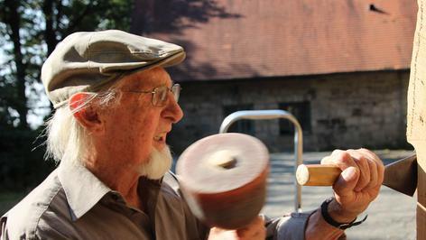 “ Grimm ist 89 Jahre alt und Stammvater der gleichnamigen Künstlerfamilie. Sein Enkel Andreas, der Kunst & Design studiert, ist mit ihm auf den Friedrichsberg gekommen. „Er musste natürlich den größten Stamm haben“, zieht der Kleinrinderfelder den jungen Mann auf. „Mal sehen, was er damit anstellt.“