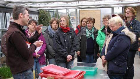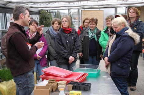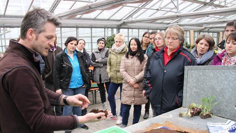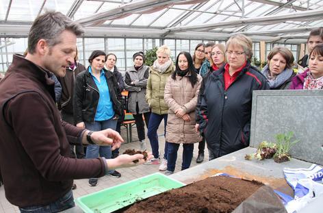 Frank Schunke greift tief in die Erde hinein. „Keimfrei und feucht muss der Boden für die Aussaat sein“, sagt er. „Der Samen sollte dunkel und trocken gelagert werden.“ 18 Frauen hören dem Gartenbauingenieur aufmerksam zu. Unterricht vom Fachmann. Direkt vor Ort, in der Gärtnerei. Anschauungsunterricht im wortwörtlichen Sinn.