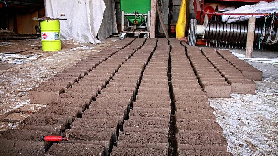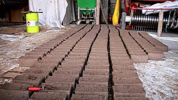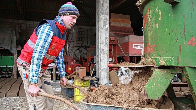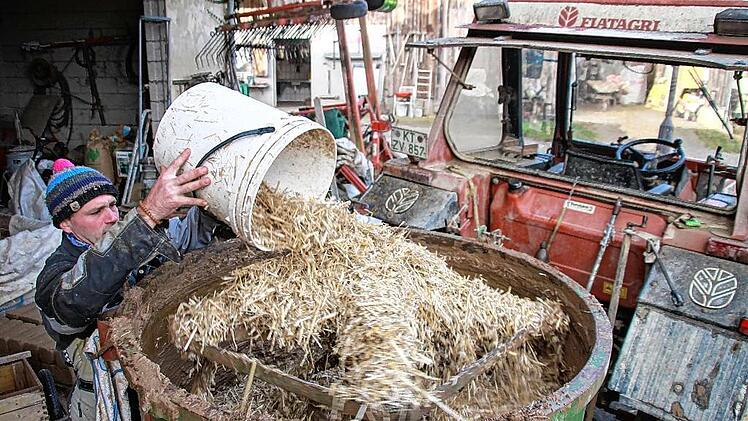 Ein Biolandwirt will auch beim Bau eines Hofladens auf die Umwelt achten, keine Chemie verwenden, sondern Materialien, die recycelbar sind. Für Martin Schleyer ist das Ehrensache. Also hat er sich mit seiner Lebensgefährtin auch darüber Gedanken gemacht, mit welchen Steinen die Innenwände hochgezogen werden. „In den 80er-Jahren hat meine Mutter mal ein Buch über den Naturbaustoff Lehm mit nach Hause gebracht“, erinnert sich der 40-Jährige. „Das war für mich gleich eine Inspiration.“ Jahre später hat sich der Repperndorfer ehrenamtlich engagiert. Zunächst hat er beim Bau neuer Häuser für die Flutopfer in Sri Lanka geholfen, später hat er Lehmöfen in Niger gebaut. Das richtige Mischungsverhältnis von Lehm, Stroh und Blähglas – einer recycelten Isoliermasse aus Altglas – hat er dort gelernt. „Die Grundstoffe habe ich alle da“, sagt der Repperndorfer und grinst. Den Lehm holt er von seinem Acker, das Stroh ebenso – und das Blähglas gibt es bei einer Firma aus Schlüsselfeld. „Der Energieaufwand für die Herstellung der Steine ist gleich Null“, sagt er. Nur der Mischer auf dem Anhänger seines Traktors braucht Strom. Dort hinein leitet Schleyer den Lehm von seinen Feldern und schüttet ein paar Eimer Stroh und Blähglas hinterher. Die Masse wird gerührt, dann öffnet Schleyer den Schieber und das braune Gemisch ergießt sich in die Schubkarre.