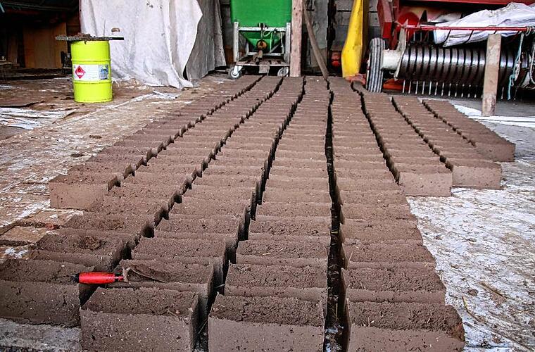 Jeanette Kähler hat derzeit die nötigen Werkzeuge für die Weiterverarbeitung vorbereitet. In zwei selbst gebaute Holzformen füllen die beiden die Masse, die noch feuchten Steine breitet Martin Schleyer dann auf dem Boden seiner Scheune aus. „Im Frühjahr wäre der Zeitpunkt besser gewesen“, sagt er. Aber jetzt, nach der Ernte, haben die beiden ein wenig Zeit übrig. „Und bis der Dauerfrost einsetzt, sind die Steine bestimmt getrocknet.“ 40 Steine schaffen die beiden in einer Stunde, insgesamt 1300 brauchen sie für ihre Innenwände. Der Hofladen wird aus Holzständern gebaut, die ebenfalls mit einem Blähglas-Lehm-Gemisch gefüllt werden. Innen werden die Wände mit Lehm und Sand verputzt, außen mit Kalkputz. Sollte der Hofladen in ferner Zukunft einmal abgerissen werden, müssen nur die Bodenplatte aus Beton und die Fensterscheiben auf den Wertstoffhof gebracht werden. „Alles andere ist recycelbar“, freut sich Martin Schleyer, der die Vorteile des Baustoffs Lehm aus eigener Anschauung kennt.