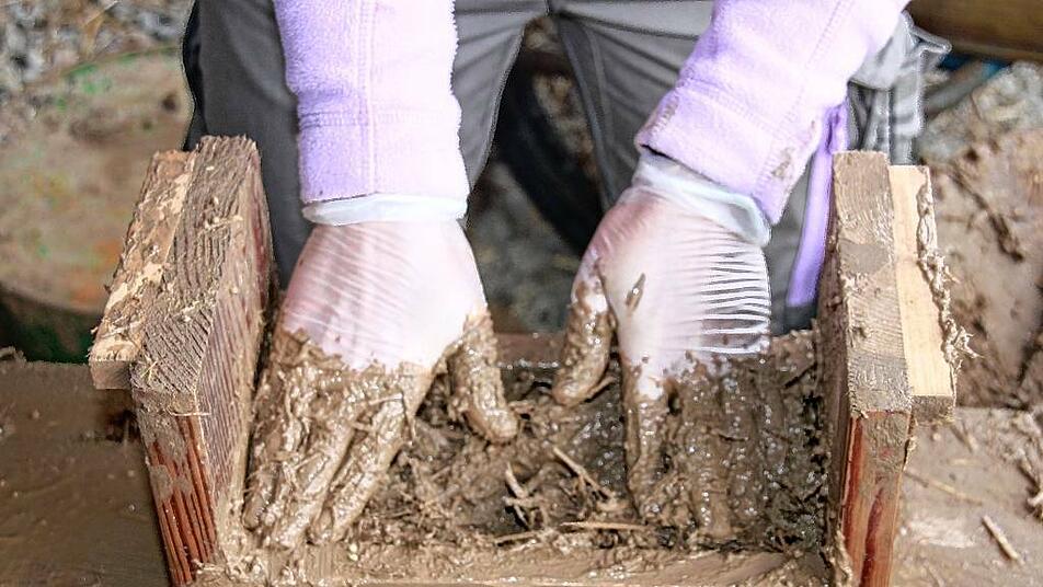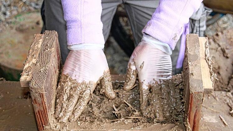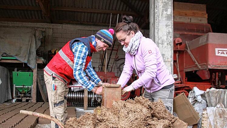 Die Masse ist glitschig – und ganz schön kalt. Martin Schleyer und Jeannette Kähler macht das nichts aus. Sie haben ein Ziel vor Augen: Im Herbst 2022 soll ihr Hofladen stehen. Und dafür formen sie jetzt nach und nach 1300 Steine aus Lehm und Stroh.