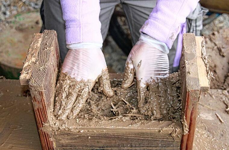 Die Masse ist glitschig – und ganz schön kalt. Martin Schleyer und Jeannette Kähler macht das nichts aus. Sie haben ein Ziel vor Augen: Im Herbst 2022 soll ihr Hofladen stehen. Und dafür formen sie jetzt nach und nach 1300 Steine aus Lehm und Stroh.