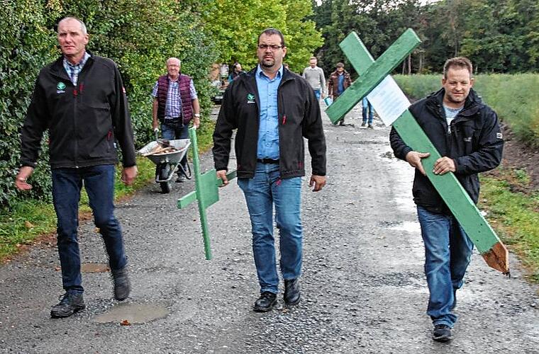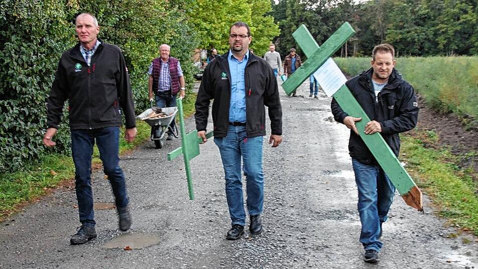 Auftakt für eine Protestaktion, die in ganz Deutschland für Aufmerksamkeit sorgt: Alois Kraus und Wilfried Distler tragen am 25. September zusammen mit Georg Eckhoff grüne Kreuze auf den Acker. Archiv