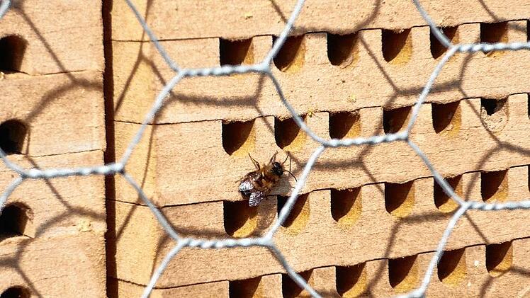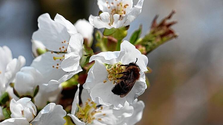 „Gehörnte Mauerbienen fliegen bei sonnigem Wetter bereits ab vier Grad Celsius, rote Mauerbienen ab zehn Grad Celsius“, erklärt Maria Lutz, die am Amt für Ernährung, Landwirtschaft und Forsten in Kitzingen für den Bereich Biodiversität zuständig ist. Honigbienen werden dagegen erst ab etwa zwölf Grad flugfähig. Ende März gab es schon einige warme Tage, die ersten Honigbienen waren bereits unterwegs. „Die Mauerbienen haben wir noch früher ausgemacht“, sagt Lutz. Was gerade für Frühblüher wie die regional angebauten Aprikosen oder Zwetschgen von Vorteil ist.