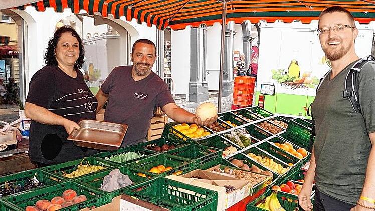 Urlaubsbedingt sind derzeit zwar nicht alle Anbieter jeden Freitag vor Ort, doch das hält die Stammkunden nicht von einem Besuch auf dem Grünen Markt ab. Einer von ihnen ist Manuel Schmitt. „Ich kaufe jede Woche hier ein“, sagt der Iphöfer. Am Stand von Michele Gentile holt er sich diesmal Äpfel. Woher die Lebensmittel kommen, ist ihm wichtig. Gentile kann es ihm genau erklären. Und Schmitt achtet auf Qualität. „Hier ist das Obst und Gemüse um Welten besser als im Supermarkt“, findet er. Beratung gehört natürlich zum Angebot. Und so erfährt Manuel Schmitt, dass die weiße Kugel, die der Obststandbesitzer gerade einem anderen Kunden zeigt, eine Charentais-Melone ist. „Die schmeckt sehr gut, ganz süß“, erklärt Michele Gentile. „So eine nehm ich auch gleich“, entscheidet der Iphöfer.