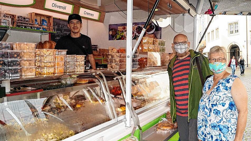 Lachs mit Reis steht am Abend auf dem Speiseplan. Dietmar Jung hätte gerne einen Aufstrich dazu. Für Hafes Adel kein Problem, der Feinkosthändler macht sofort ein paar Vorschläge. Er hat in seinem Wagen auf dem Grünen Markt in Kitzingen eine große Auswahl an Produkten dabei.