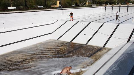 Die Vorbereitungen auf die Eröffnung laufen trotz der Witterungsbedingungen weitgehend problemlos. Oliver Werner vom Bauhof manövriert den Hubsteiger geschickt an der Riesenrutsche entlang und säubert auf zwei bis zehn Metern Höhe die Außenwand des gelben Ungetüms. Zuerst mit einem Schrubber und Reinigungsmittel, später mit Hochdruck und Wasser. „Ein Jahr wird von außen sauber gemacht, das nächste von innen“, erklärt er. Seine Kollegen reinigen unterdessen mit Muskelkraft das große und kleine Becken. Die schadhaften Fliesen sind längst repariert worden, auch die Beregnungsanlage läuft wieder. Ein Teil der Umkleidekabinen wird neu gestrichen, die Stadtgärtner trimmen die Rasenflächen. „Ein paar Stolperfallen gibt es jedes Jahr“, sagt Trabert und deutet auf die Platten rund um das große Becken. Die Pflasterer wissen, was zu tun ist.