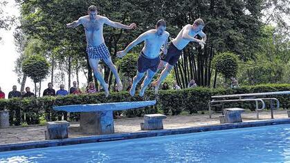 Drei junge Männer des Teams waren so gut gelaunt, dass das zu dieser Zeit noch richtig kalte Wasser des Freibades nebenan sie nicht schrecken konnte. Tom Volkamer, Tobias Zehnder und Jochen Bansemir sprangen spontan ins blau funkelnde, aber mit 17 Grad Celsius noch empfindlich kühle Nass. Fabelhafte Fontänen und der begeisterte Beifall aller Umstehenden gaben den Startschuss für einen hoffentlich sonnigen Sommer im Terrassenbad.