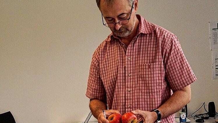 Die drei Pomologen nehmen die Früchte genau unter die Lupe, um die Sorte zu bestimmen. Form, Färbung, Verteilung der Färbung, der Stiel, der Kelch, die Größe – es gibt viele Merkmale, mit deren Hilfe die Fachleute die Früchte unterscheiden können. Einfach ist es trotzdem nicht. Weil die Sorte nicht nur die Frucht an sich ist, sondern auch der Baum, den die Pomologen beim Termin im Landratsamt ja nicht sehen. Zudem können sich selbst Früchte der gleichen Sorte unterscheiden. In einem trockenen Jahr sehen sie anders aus als in einem feuchten Jahr, von einem alten, ungeschnittenen Baum anders als von einem jungen. Auch Insekten können Spuren hinterlassen. „Je kleiner die Frucht, desto weniger prägen sich die typischen Merkmale aus“, sagt Steffen Kahl. „In schlechten Jahren kann man manche Sorten gar nicht bestimmen“, fügt Wolfgang Subal an. Gerhard Horak verfolgt das Tun der drei Pomologen mit großem Interesse. Er setzt sich seit vielen Jahren für den Erhalt der Casteller Streuobstwiesen ein, pflanzt selbst auf von ihm gepachteten Flächen alte Sorten. Auch er hat Äpfel und Birnen abgegeben, die nun begutachtet werden, zudem konnten andere Bürger bei ihm ihre Proben abliefern.