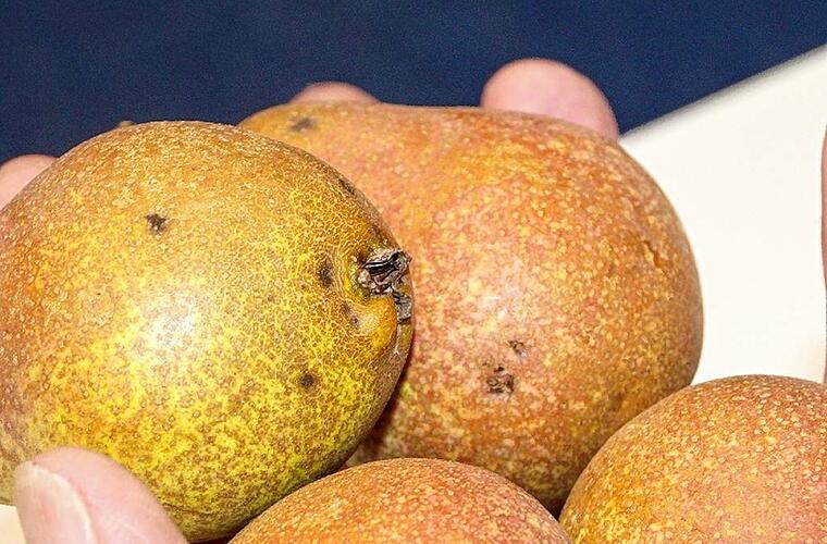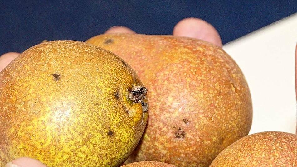 Ist es ein „Trockener Martin“ oder nicht? Die drei Fachleute sind sich nicht ganz einig. Eine Vergleichsprobe soll auch die letzten Zweifel beseitigen, ob die Birne, die da vor ihnen im Korb liegt und an einem Baum im Landkreis Kitzingen gewachsen ist, wirklich der seltenen Sorte angehört. Es ist nur eine von über 200 Proben, die an diesem Tag im Landratsamt begutachtet werden.