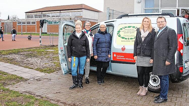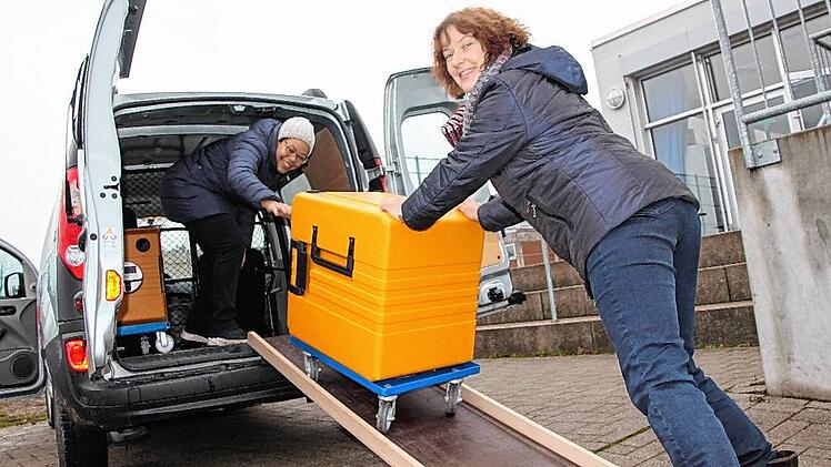 Das hält! Andrea Keil reckt den Daumen in die Höhe und lacht. Sie sieht aus, als würde sie eine neue Rutsche testen, wie ein Kind auf dem Spielplatz. Nur, dass die Rutsche in ihrem Fall eine Autorampe ist. Sie soll dafür sorgen, dass das warme Mittagessen leichter zu den Schülern der Nikolaus-Fey-Schule Wiesentheid transportiert werden kann. Die Rampe führt in den Laderaum eines Renault Kangoo. Dass der Schulverband dieses Auto anschaffen konnte, ist Wiesentheider Firmen zu verdanken.