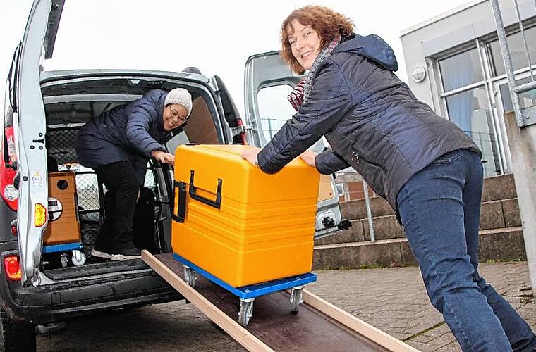 Das hält! Andrea Keil reckt den Daumen in die Höhe und lacht. Sie sieht aus, als würde sie eine neue Rutsche testen, wie ein Kind auf dem Spielplatz. Nur, dass die Rutsche in ihrem Fall eine Autorampe ist. Sie soll dafür sorgen, dass das warme Mittagessen leichter zu den Schülern der Nikolaus-Fey-Schule Wiesentheid transportiert werden kann. Die Rampe führt in den Laderaum eines Renault Kangoo. Dass der Schulverband dieses Auto anschaffen konnte, ist Wiesentheider Firmen zu verdanken.