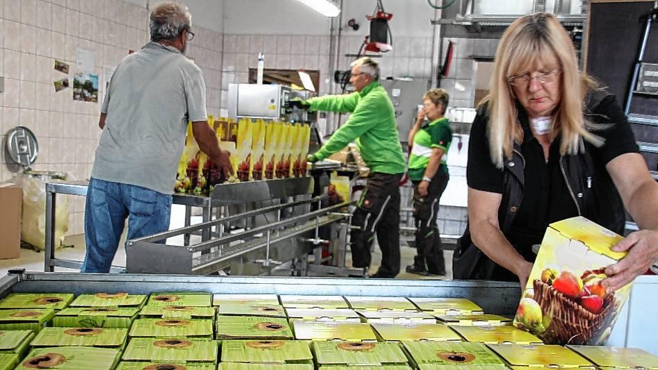 Läuft der Laden – und das ist im Herbst an den Produktionstagen Donnerstag, Freitag und Samstag rund um die Uhr der Fall – werden pro Stunde 850 bis 900 Fünf-Liter-Boxen gefüllt. „Manchmal kommen auch große Obstbauern“, sagt Weinmann. Dann werden an einem einzigen Tag schon einige tausend Liter Apfelsaft gepresst und abgefüllt. An diesen Tagen stellen die Kleinlangheimer allerdings ein extra Förderband auf.