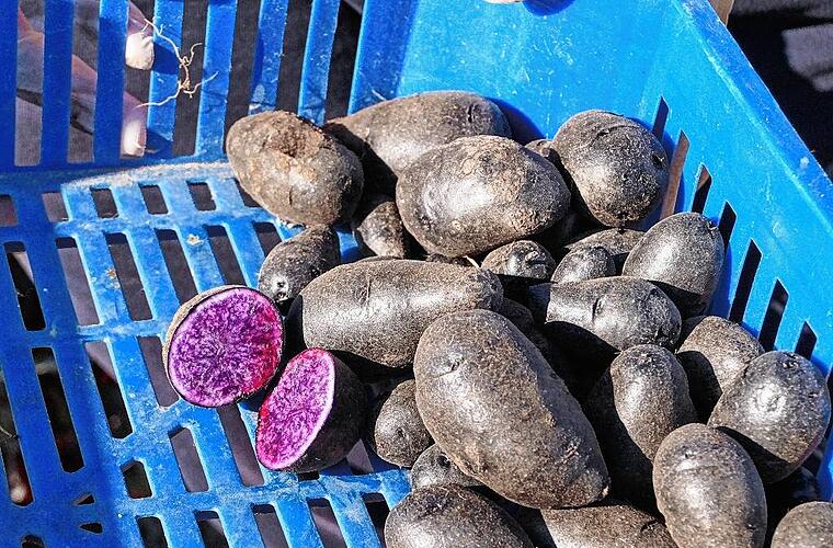 Drei Sorten Kartoffeln haben die Frauen unter Anleitung von Fachlehrerin Gabriele Schenk angebaut: Annabell mit ihrem typisch gelben Fruchtfleisch. Die blaue St. Galler, die ihre Farbe auch beim Kochen und Frittieren behält und damit zum Blickfang auf dem Teller wird. Und Bamberger Hörnla, die kleine, fränkische Kartoffel mit der unregelmäßigen Form. Alle drei Sorten wurden auf verschiedene Arten angebaut: In ebener Erde und im Wall – auch Bifang genannt. Ein besonderes Experiment wagten die Frauen mit den Bamberger Hörnla: Sie wurden nicht in die Erde gelegt, sondern auf eine mit Holzbrettern umfasste gemähte Grasfläche und lediglich mit Stroh bedeckt.