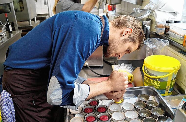 Konzentriert füllt Steffen Szabo die kleinen weißen Behälter. Kräftiges Dunkelrot, sattes Senfgelb, Weiß. Er ist heute für die Häppchen und den Butterservice zuständig. Der Chef packt mit an, wie alle anderen in der Küche auch. Nicht für jeden Sternekoch ist das selbstverständlich. Für den 28-Jährigen schon.