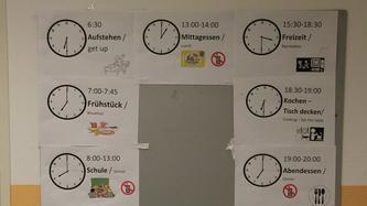 Im langen Gang, auf dem vor zwei Jahren noch die Altenpflegerinnen Essen und Medikamente austrugen, ist die Tagesstruktur nachzulesen: 6.30 Uhr: Aufstehen, 7 bis 7.45 Uhr: Frühstück, 8 bis 13 Uhr: Schule. Bis zur Schlafenszeit um 22 Uhr ist der Tag durchgetaktet. Die Betreuer legen Wert darauf, dass die Jugendlichen mithelfen – beim Essen vorbereiten, beim Aufräumen, beim Bad putzen.
