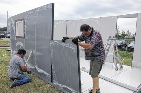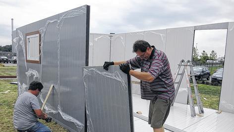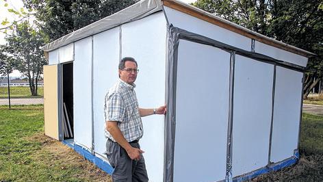 Neueste Erfindung: Statt Karton werden wärmegedämmte Sandwichelemente für den Bau der Hütten verwendet. Der Aufwand ist gering, das Haus steht innerhalb von zwei Stunden.