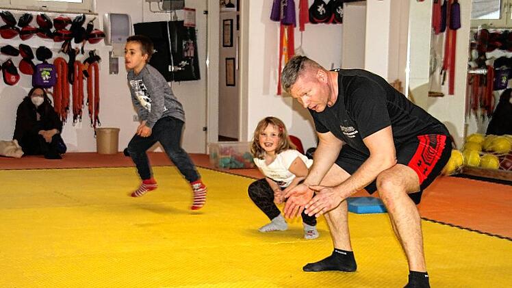 Eine Menge Spaß haben die Kinder beim Rehasport mit Oliver Schmidt. Micha und Annalena lernen beispielsweise, wie ein Frosch durch die Halle zu hüpfen. Fotos: Ralf dieter