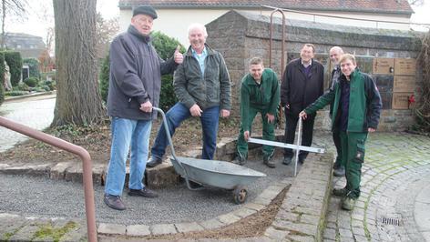 Klemens Stockmann und Norbert Michels von der Stadtgärtnerei sorgen für einen stufenfreien Zugang zur Urnenwand im Alten Friedhof.