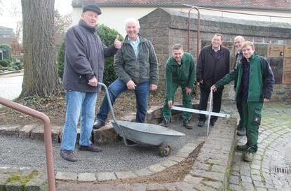 Gesagt, getan: Im Rahmen ihrer Instandsetzungs-Arbeiten im Alten Friedhof gingen die beiden Männer ans Werk. Zweieinhalb Tage benötigten sie, bis neben der Treppenmauer aus Granit eine zirka einen Meter breite Rampe mit sechsprozentiger Steigung entstanden war. „Der Unterbau besteht aus verdichtetem Mineralbeton, auf den wir Split aufgebracht haben, damit es im Winter keine Glättegefahr gibt“, informiert Stockmann. „Als Begrenzung haben wir eine Muschelkalkmauer gesetzt.“
