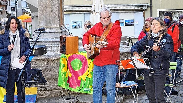 Christine Jenike (CSU) zitierte aus einem Brief ihrer Mutter auf der Flucht aus Schlesien 1945 in eine ungewisse Zukunft und erzählte von einer jungen Ukrainerin heute, die der Welt über Bilder und Filme in sozialen Medien die Kriegssituation in ihrer Stadt zeigt. „Nur zwei von Millionen Frauen, Kindern und Männern, die nicht nur in Europa, sondern auf der ganzen Welt von Zerstörung und Tod bedroht sind, die jeden Tag als Bedrohung für das Leben ihrer Kinder erleben, als Verlust von Heimat und Sicherheit, als Kampf ums Überleben. Zwei von Millionen Menschen, die sich nichts sehnlicher wünschen als Frieden.“ Auf dem Marktplatz seien nun Menschen zusammengekommen, um zu zeigen, dass sie für diesen Frieden auftreten, dass sie den Menschen, die von Krieg und Gewalt betroffen sind, nicht gleichgültig gegenüberstehen. Und um denjenigen, die Hilfe brauchen, zu sagen, dass man versuchen werde, ihnen zu helfen mit den Mitteln, die uns zur Verfügung stehen.