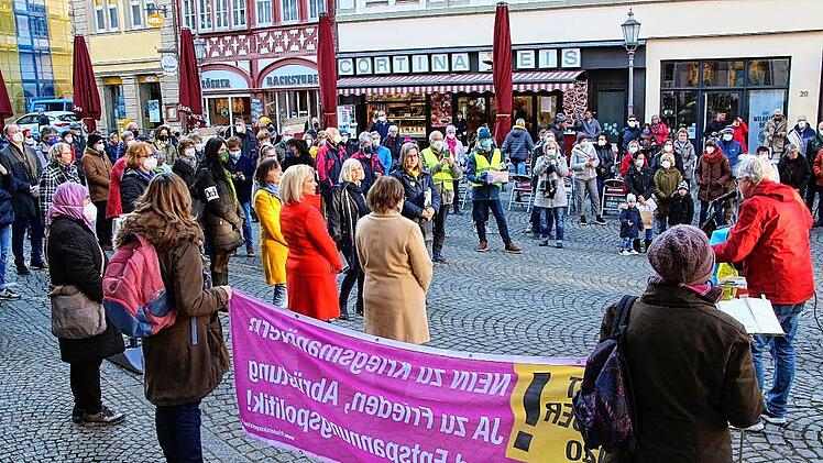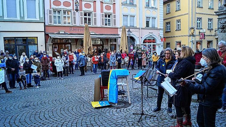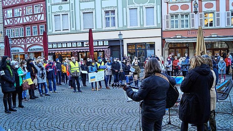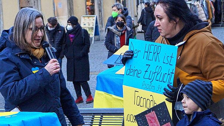 Ihr jüngster Sohn stelle Fragen nach der Verwandtschaft in der Ukraine, erzählte Olga Kimbel, sie sind schwer zu beantworten, die Lage schwer zu erklären. Er ist wie seine beiden Geschwister in Kitzingen geboren, der Stadt, die für die Ukrainerin die zweite Heimat geworden ist. „Danke, dass ich hier willkommen bin“, sagte sie und äußerte die Hoffnung, dass die Menschen hier auch anderen aus der Ukraine helfen: „Meine große Bitte: Helfen Sie meiner Freundin“, bat sie mit tränenerstickter Stimme. Die Freundin ist auf der Flucht, in Polen gestrandet, doch weil sie vier Kinder hat, will niemand sie aufnehmen. „Sie schläft irgendwo auf dem Boden.“ Noch während der Mahnwache, während die Anwesenden den tröstenden Worten von Dekanin Kerstin Baderschneider lauschten, die von der Ohnmacht sprach, die man empfinde, vom Trost, die Friedensgebete geben könnten, noch während alle gemeinsam „We shall overcome“ sangen, wurden erste Kontakte geknüpft, um eine Unterkunft für die Frau und ihre Kinder zu finden. Und schon am nächsten Tag war eine Wohnung in Wiesenbronn gefunden, wurde zudem sogar angeboten, die Geflüchteten mit dem Auto in Polen abzuholen – aus über 900 Kilometern Entfernung. Schon an diesem Donnerstag soll die Fahrt stattfinden.