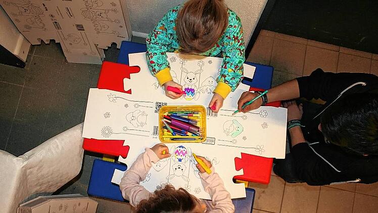 Begeistert malen die Kinder die aufgedruckten Osterhasen, Küken und Blumen farbig aus. Hier und da wird mal der passende Buntstift vermisst oder über die korrekte Farbgebung diskutiert. Was nach einer alltäglichen Situation aus dem Kindergarten klingt, findet in einem Supermarkt statt. Die Werke der Kinder werden am Ende nicht aufgehängt oder mit nach Hause genommen, sondern für einen guten Zweck verkauft.