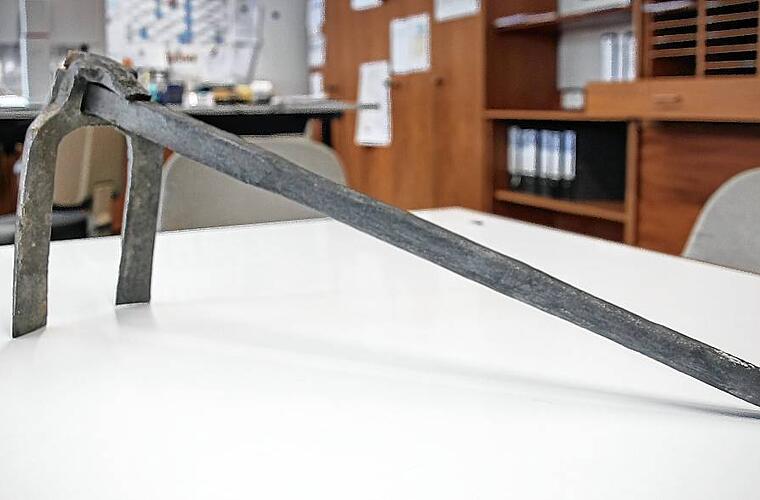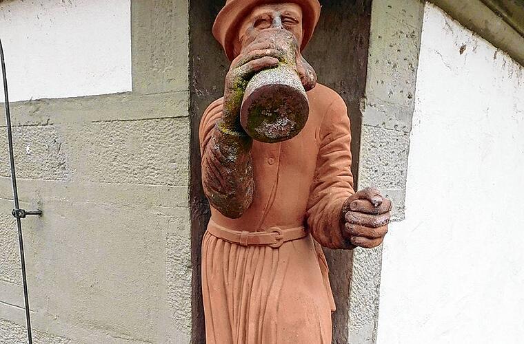 Zwei Tage lang hat sich der Experte die Fassade von oben bis unten genauestens angeschaut. Dank eines Hubsteigers ging es für ihn bis hinauf unters Dach. Seine Erkenntnis: „Das ist schon eine größere Maßnahme.“ Bröckelnde Stellen hat er gesehen, einige Risse und auch Schäden an besonders wertvollen Stellen wie dem Allianzwappen oder den Schrifttafeln. Beim Kitzinger Häcker ist er gleich tätig geworden. Die Symbolfigur hat in der einen Hand eine Kandel und in der anderen einen „Korscht“, was mit Weinbergshacke ins Hochdeutsche übersetzt werden kann. Die war allerdings nicht mehr ordnungsgemäß befestigt, drohte bei Sturm aus rund fünf Meter Höhe herunterzufallen. „Das hätte tatsächlich für einen Passanten böse enden können“, sagt Klaus Rützel, Leiter des Hochbauamtes in Kitzingen. In dessen Räumen lagert der rund vier Kilogramm schwere Korscht so lange, bis er wieder an seinen ursprünglichen Platz kommt.