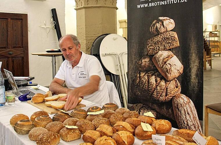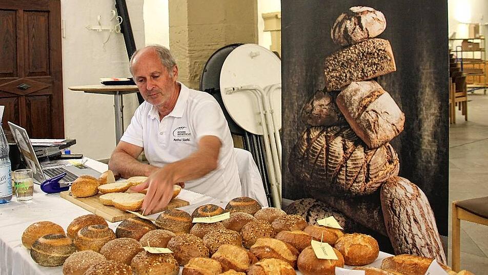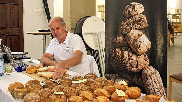 Acht verschiedene Produkte liegen in den Körben, die Philipp Scheckenbach in die Rathaushalle trägt, das klassische Brötchen, der Malzkipf, ist dabei, das Urkraftbrot, Backwaren mit Emmer und Dinkel... Die Urgetreide kommen vor allem bei den jüngeren Leuten gut an, beobachtet der Bäckermeister. „Die sind gesundheitsbewusster und da kann man als Biobäckerei punkten.“ Scheckenbach stellt die Körbe auf einen langen Tisch, an dem schon Manfred Stiefel sitzt, einen Laptop vor sich, ein Schneidbrett, ein scharfes Messer. Mehr Ausstattung braucht der Brotprüfer nicht. Die Instrumente, die er für seine Arbeit nutzt, sind seine Sinne.