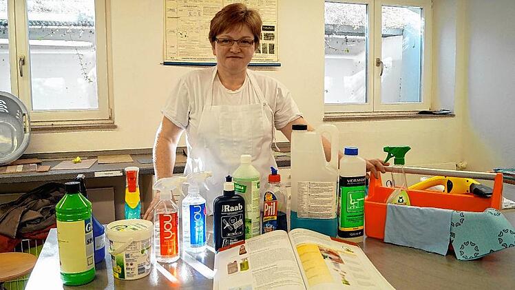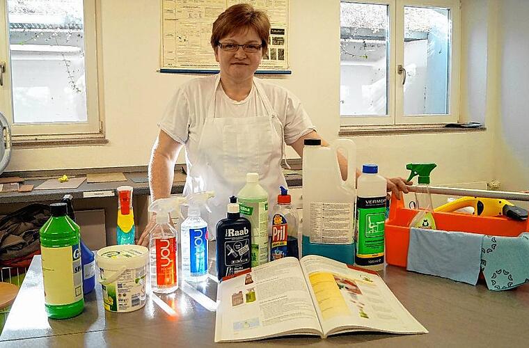 Gar kein gutes Gefühl hat man oft beim Blick auf die vielen Putzmittel in den Supermarkt- und Drogerieregalen sowie auf die vielen verschiedenen Lappen und Arbeitsgeräte, die überall angeboten werden. Was ist das richtige Mittel? Wie viel muss man nehmen? Wie sieht der richtige Schrubber aus? Es sollte gutes Reinigungsmaterial sein, sagt Gabriele Schenk und nimmt einen Schrubber zur Hand. Der Stiel reicht ihr gerade mal bis auf Brusthöhe. „Viel zu kurz“, sagt sie und hält die Hand an die Nase: „Er muss bis dahin reichen.“ Passen die Geräte nämlich ergonomisch nicht, wirkt sich das auf den Körper aus. Rückenschmerzen, Kopfschmerzen, Verspannungen in den Schultern können die Folge sein.