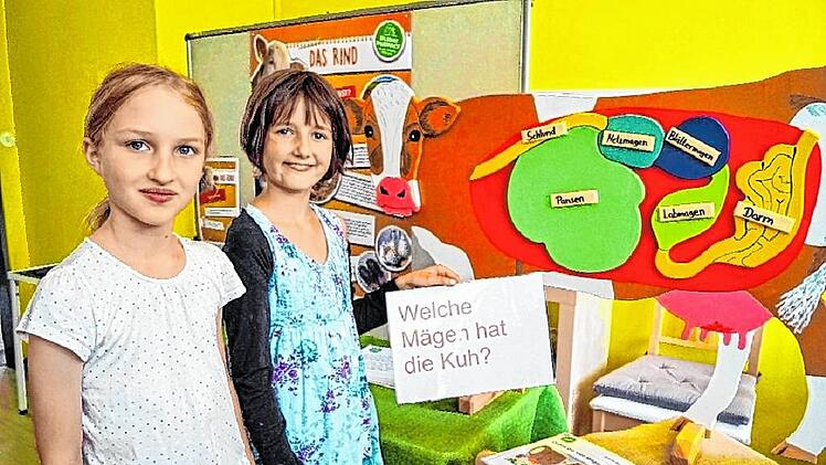 Gleich nebenan stehen Elina und Annika vor einer hölzernen Kuh. Mit Magneten können sie die Innereien an die richtige Stelle platzieren und verraten gleich mit, was aus Kuhmilch so alles gemacht wird. An dieser Station können die Schüler erkunden, was es bedeutet, wenn eine Kuh „trocken steht“, und warum Milch überhaupt weiß ist.