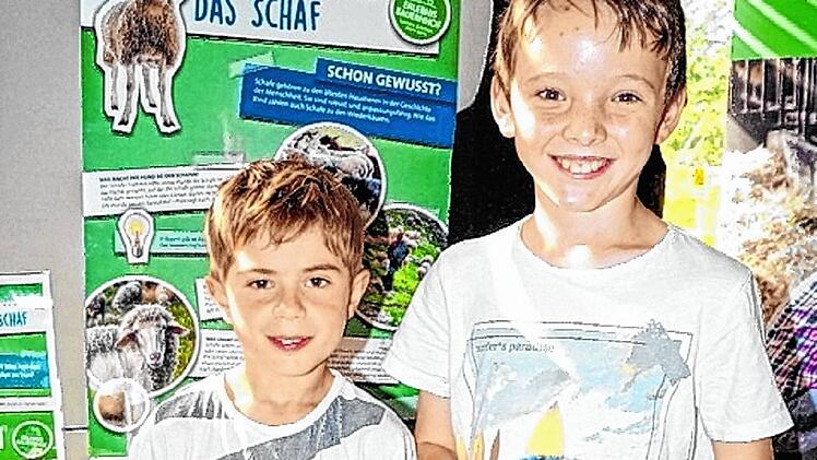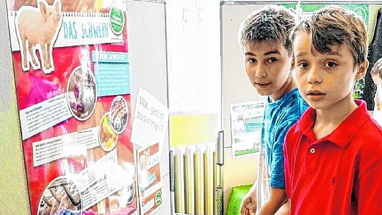 Sechs Stationen sind im kleinen Raum in der Schule aufgebaut. Jonathan und Fritz stehen vor der Station Schwein. Dort gibt es nicht nur viele Informationen in Wort und Bild über die Aufzucht und das Leben der Schweine. Auch dass von ihnen die Gelatine kommt, die in vielen Gummibärchen zu finden ist, haben die Kinder gelernt. Und wie die Tiere überhaupt heißen. Was ist ein Ferkel und was ein Frischling? Und wie heißen die Muttertiere? In Nullkommanichts haben die beiden Jungs die Kärtchen mit den Namen richtig zugeordnet.