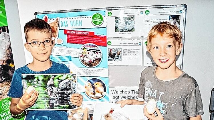 Mit Farbe kennen sich auch Fabio und Samuel aus; sie erklären die Station „Huhn“. Denn ob ein Huhn weiße oder braune Eier legt, liegt keinesfalls an der Farbe seiner Federn oder am Futter. „Das liegt an der Ohrscheibe“, weiß Fabio jetzt, und erklärt auch gleich, was das ist: ein kleiner Fleck an der Seite des Kopfes. Nach 21 Tagen schlüpft ein Huhn und das Schlüpfen ist ganz schön anstrengend, das kann einen ganzen Tag lang dauern. Samuel zeigt derweil, woran man ein im Handel gekauftes Ei erkennt: Es hat einen Stempel. „Da steht die Herkunft drauf.“
