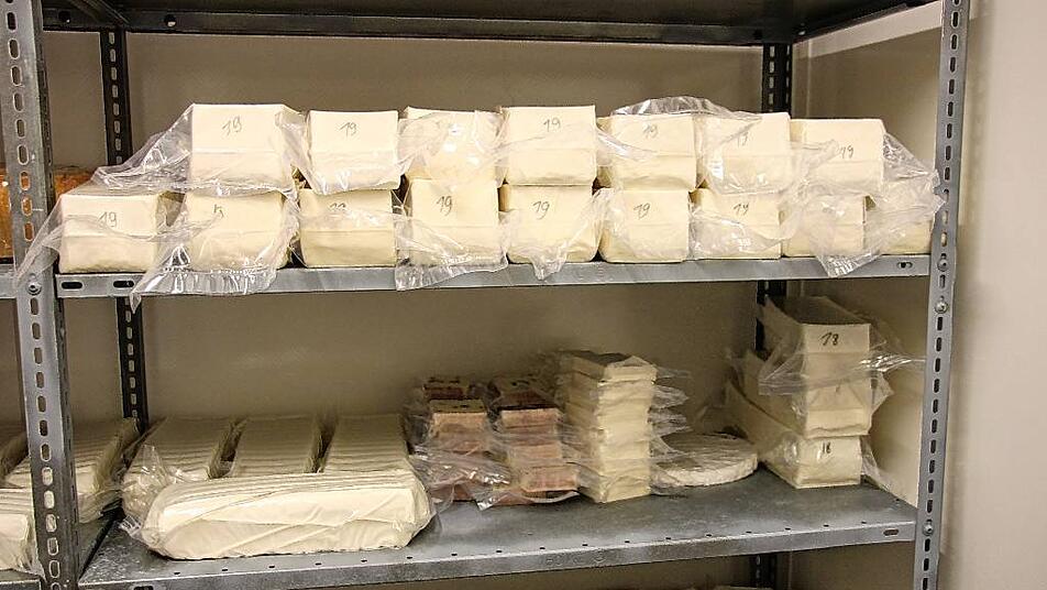 Fürs Foto wuchtet die Molkereifachfrau kurz einen riesigen Frankenlaib vom Regal und legt ihn dann ganz vorsichtig wieder ab. Zehn bis zwölf Kilo ist so ein „Trumm“ schwer, während der kleine Camembert später, im Verkauf, gerade mal 160 Gramm wiegt. Es ist ein ungeplanter Handgriff unter vielen geplanten, denn so ein Käse wird sehr oft in die Hand genommen, bevor er beim Kunden auf dem Teller liegt. Die Blöcke, die später geschnitten verkauft werden, die großen und kleinen Laiber unterschiedlicher Höhe müssen immer wieder mit Salzwasser geschmiert werden, damit sich eine Rinde bildet. „Ich fördere das Gute, damit das Schlechte nicht wachsen kann“, erklärt Brunner – die schlechten Bakterien sollen keine Chance haben. Auch gedreht werden muss der Käse immer wieder, damit er gleichmäßig reifen kann. 15 Grad hat es in diesem Raum, kühl gegenüber dem Produktionsraum, warm gegenüber dem Kühlraum, in den der Käse später wandert. Der eine früher, der andere später, je nach Sorte, je nach Reifegrad. Quark reift wenige Tage, Camembert eine Woche, der Frankenlaib mindestens drei Monate. Vom Ziegenlaibchen verkauft Carola Brunner mehrere Reifestufen – je nachdem, ob es der Kunde zart und mild oder fest und würzig mag. Manch einer nimmt ihn gar als Parmesan-Ersatz aus der Region.