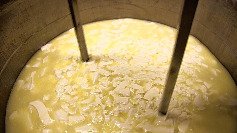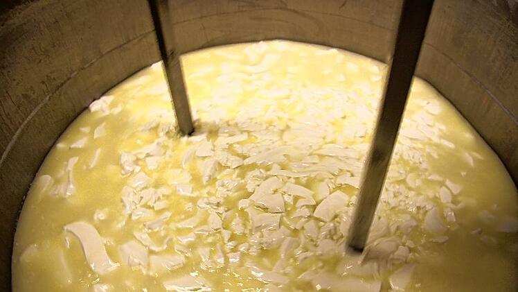 Auch Lab hat sie am Morgen schon zugegeben, ein Enzym aus dem Kälbermagen, das bewirkt, dass die Milch gerinnt. Das geht schnell, und deshalb muss je nach Sorte in bestimmten Zeitabständen oder gar dauernd gerührt werden.