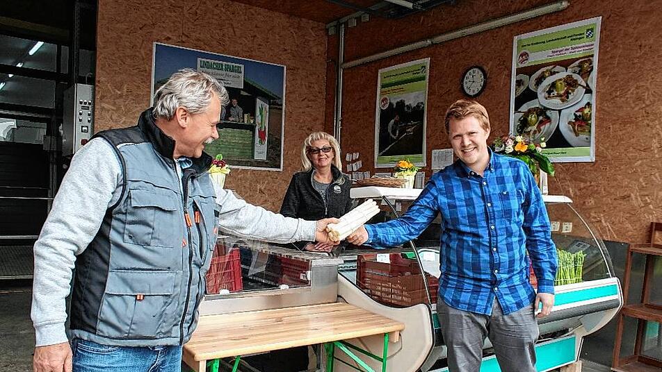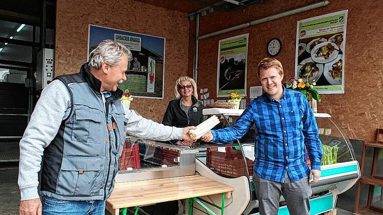 Vorsichtig hält Peter Seufert den Bund Spargel zusammen. „Jetzt machst zwä Gummi rum, dann hält des scho“, sagt er zu seiner Frau. Und dann gibt er das weiß schimmernde Gemüse weiter. Wie einen Staffelstab, so hat die Fotografin es verlangt, übernimmt Sohn Sebastian den Spargel – wie er in einigen Jahren auch das Zepter im Betrieb übernehmen wird. Peter Seufert ist froh, dass er einen Nachfolger hat. Selbstverständlich ist das nämlich nicht.