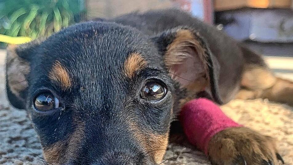 Es ist der 1. August 2021. Zwei Urlauber aus Bad Hersfeld vertreten sich auf dem Parkplatz an der A3 in der Nähe des Biebelrieder Kreuzes die Füße. Da nehmen sie eine Bewegung wahr, ein braunes Etwas im Gras. Es ist ein Hundebaby, es blutet am Bein, es geht ihm nicht gut. Ganz offensichtlich ist es dehydriert. Die Rhöner telefonieren. Am Ende bringen sie das Tierchen in die Tierklinik im nahen Würzburg-Reichenberg.