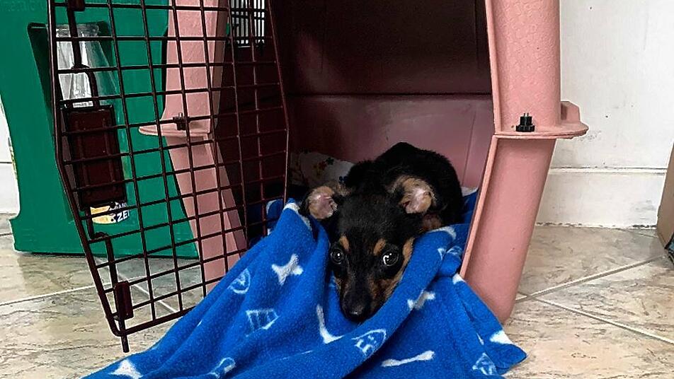 Kleiner Dackel-Welpe halb tot auf Parkplatz gefunden