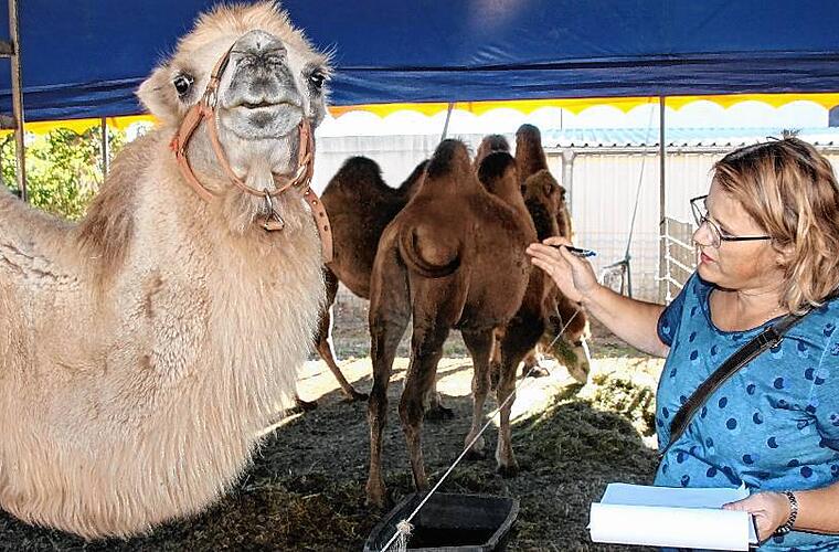 Solche Patienten hat Dr. Claudia Baldauf auch nicht alle Tage. Wobei: Patienten ist das falsche Wort. Die Trampeltiere vom Circus Solero sind wohlauf. Der Besuch der Veterinärärztin ist Routine.
