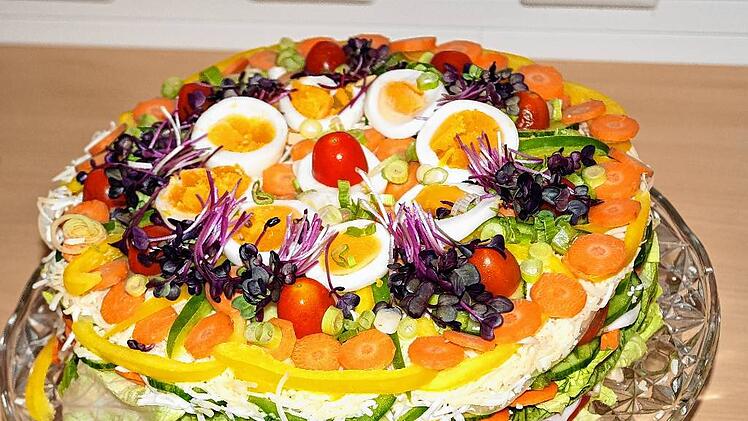 Salattorte (10 Tortenstücke): 1 Blattsalat, 1 kleine Salatgurke, 2 Zwiebeln, 1/2 Stange Lauch, 4 hartgekochte Eier, 5 Kirschtomaten, 1 gelbe Paprika, 1 rote Paprika, 4 Tomaten, 150 g gekochter Schinken, 150 g Gouda in Scheiben. Soße: 1/2 Glas Miracle-Whip oder Mayo, 2 Becher Naturjoghurt, etwas Salz, Pfeffer, Zucker, Maggi, evtl. etwas Knoblauch, etwas Schnittlauch oder Kresse zur Deko. Zubereitung: Tortenring auf eine Platte mit Vertiefung stellen (am Tortenboden sammelt sich Flüssigkeit). Salatblätter waschen, gut trocknen und als erste Schicht einen Teil der ganzen Blätter auf dem Boden verteilen. Darauf Tomaten in Scheiben, dann Lauch in feinen Ringen. Schinkenscheiben darüber. Restliche Salatblätter darauf, etwas andrücken. Eier in Scheiben schneiden und auflegen (einige Scheiben zur Deko zurückbehalten), mit den in Scheiben geschnittenen Gurken belegen. Zwiebelringe (fein geschnitten) auflegen. Das Ganze mit geriebenem Käse bestreuen. Dann mit Paprikastreifen, Eierscheiben und halbierten Kirschtomaten ausgarnieren. Einige Stunden oder über Nacht gekühlt ziehen lassen. Flüssigkeit abgießen oder abtupfen, Tortenring entfernen, mit einem scharfen Messer in Stücke schneiden. Aus den angegebenen Zutaten eine Soße für ein Dressing zubereiten und zum Salat reichen.