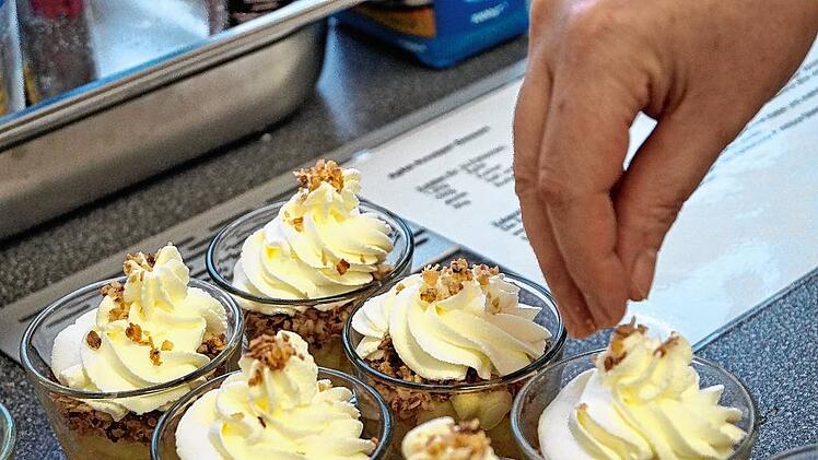 Apfel-Knusper-Dessert (10 Personen): 1,2 kg Äpfel, 150 g Zucker, etwas Saft und Schale einer Zitrone, 50 g Butter, 50 g Zucker, 120 g grobe Haferflocken, 400 g Sahne, 1 Päck. Vanillezucker. Zubereitung: Äpfel waschen, schälen, in Stücke oder Würfel schneiden. Mit Zitronensaft, Zitronenschale und wenig Wasser aufkochen. 5 Min. auf der Herdplatte stehen lassen, anschließend in eine verschließbare Schüssel füllen. Butter erhitzen, Zucker und Haferflocken zugeben, goldbraun rösten und auskühlen lassen. Diese Vorbereitungen können schon am Vortag getroffen werden. Sahne mit Vanillezucker steif schlagen. Apfelstücke in Glasschalen füllen, mit Sahne bespritzen, Flocken darüberstreuen.