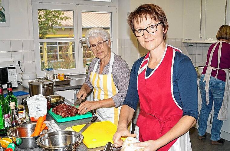 Die Zubereitung geht erstaunlich schnell – weil Monika Hegwein die Rezepte entsprechend ausgewählt hat. Jeder ist für ein anderes Gericht verantwortlich, packt konzentriert an. Petra Gerlach und Gisela Ott sind für das Wildragout zuständig. „Das macht man sonst nicht so oft“, sagt Gisela Ott. Sie ist es gewohnt, größere Feste auszurichten. „Wir sind eine große Familie.“
